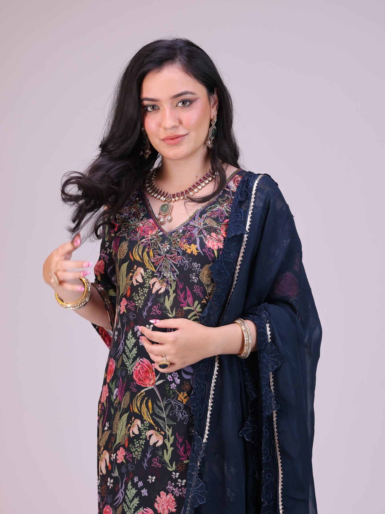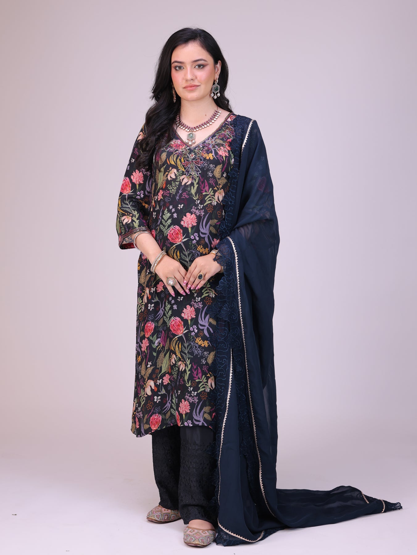 Elegant blue kurta set for women, crafted in a bespoke floral print and enhanced with delicate embroidery on the neckline and sleeve hem. Paired with embroidered cutwork pants and a matching navy dupatta, this designer ensemble exudes graceful charm—perfect for festive occasions, weddings, and celebrations.
