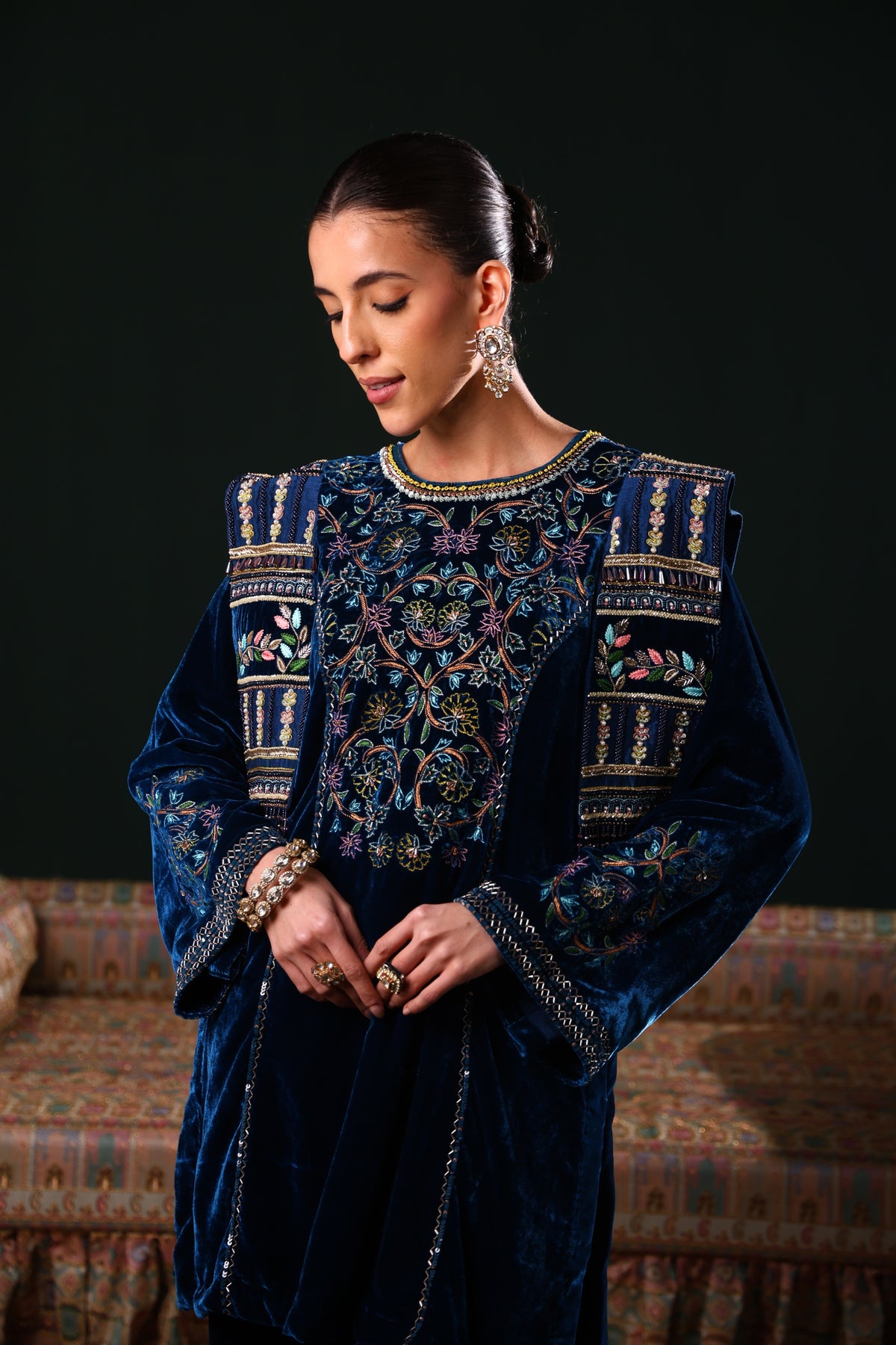 Presenting a midnight blue embroidered velvet set, lavishly adorned with multicoloured threadwork, structured shoulders, and ornate sleeve detailing. The flowing velvet salwar adds comfort and movement, making this ensemble both statement-making and wearable. Perfect for grand festive nights, wedding functions, and luxurious gatherings, it embodies premium craftsmanship and regal glamour. Available for full colour customisation to suit your style preferences.