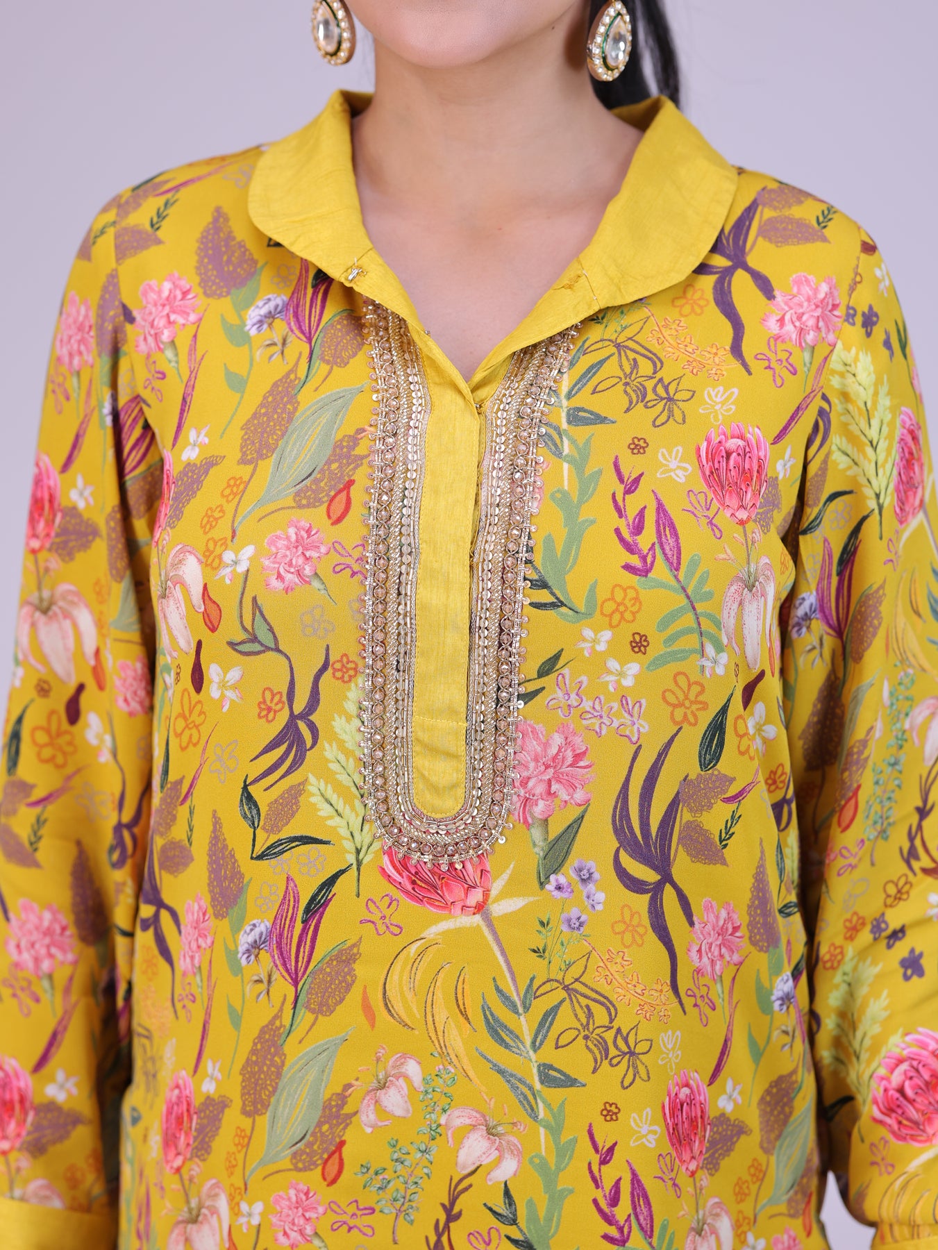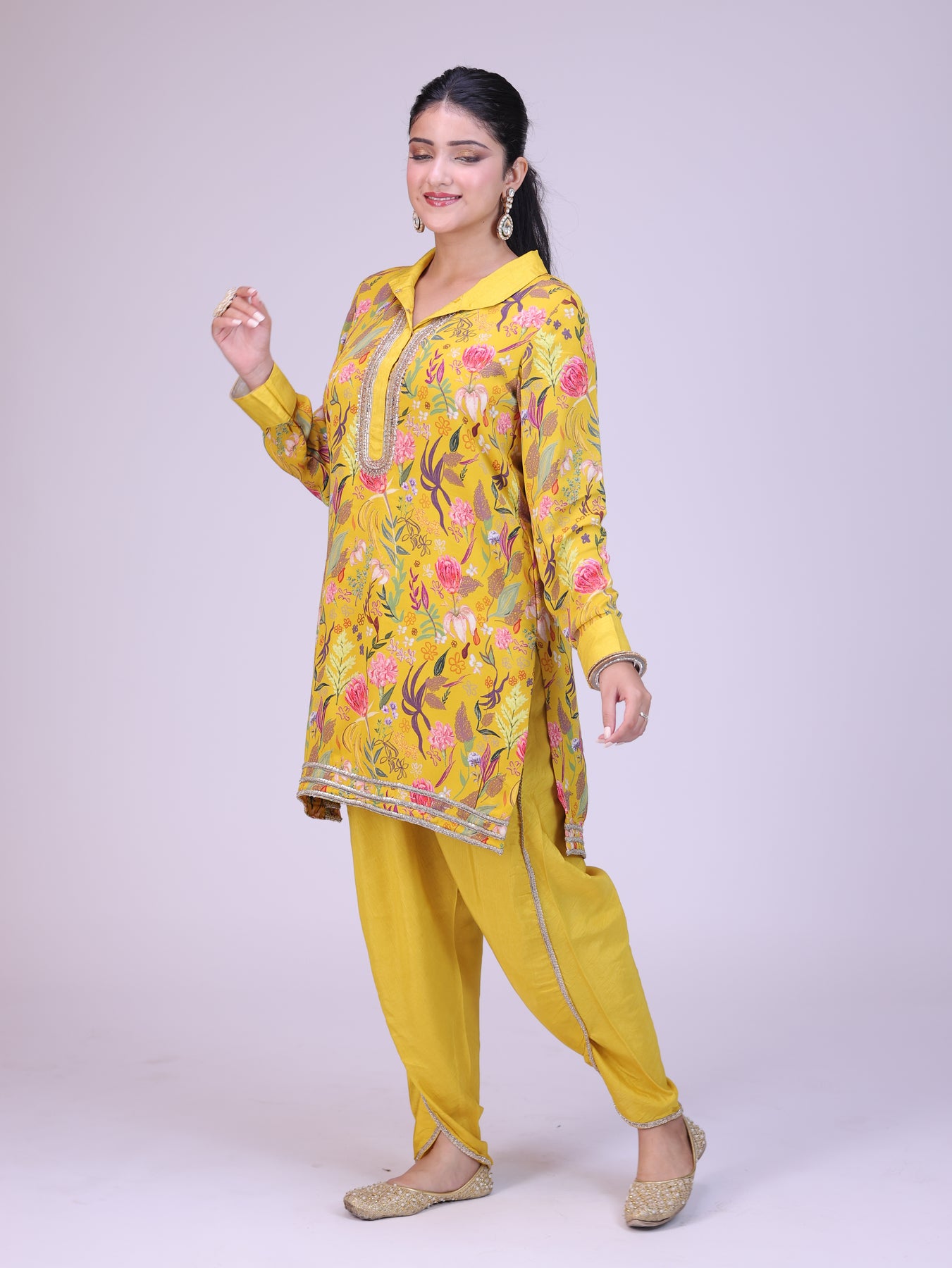 “Custom-print floral kurta for women, featuring intricate embroidery on the neckline and paired with sleek dhoti pants. This designer kurta set combines vibrant prints with elegant detailing, making it a perfect choice for festive occasions, weddings, and celebrations.”