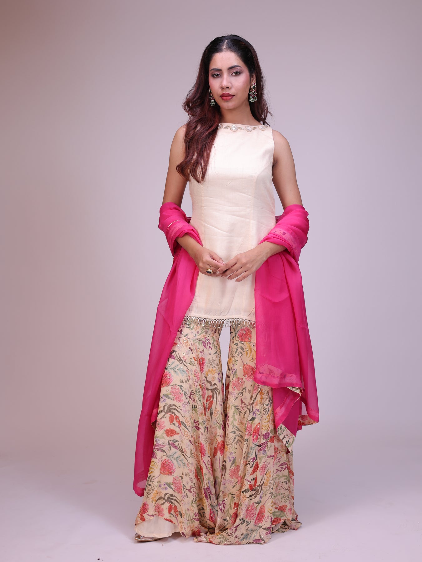 “Chic ivory shirt set for women, featuring delicate floral embroidery on the neckline at both front and back. Paired with a flowy floral sharara and a vibrant pink dupatta, this designer ensemble blends understated elegance with a refreshing pop of color—making it a standout choice for festive wear and celebrations.”