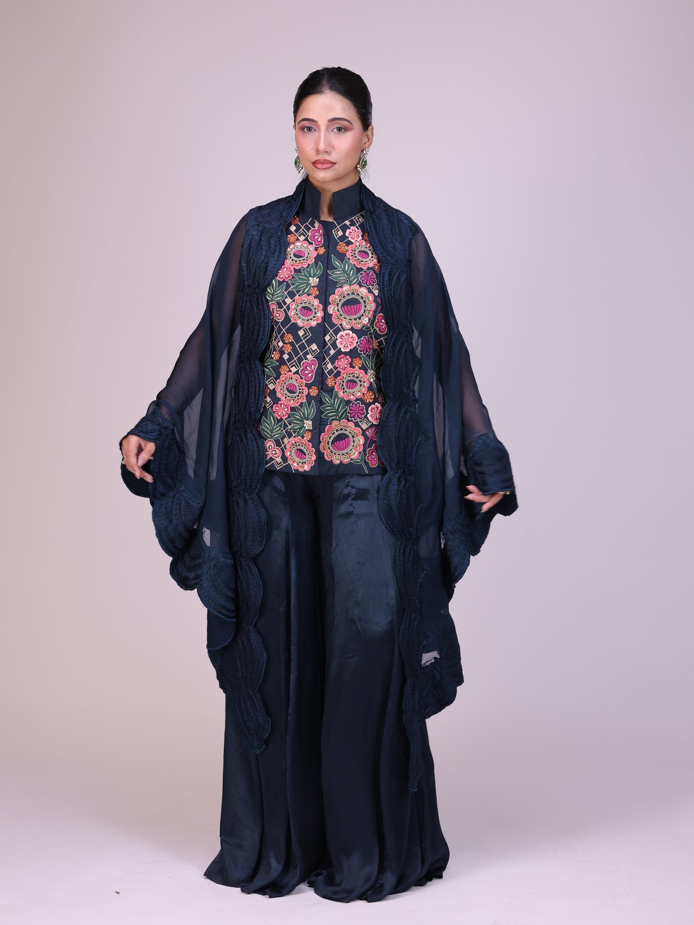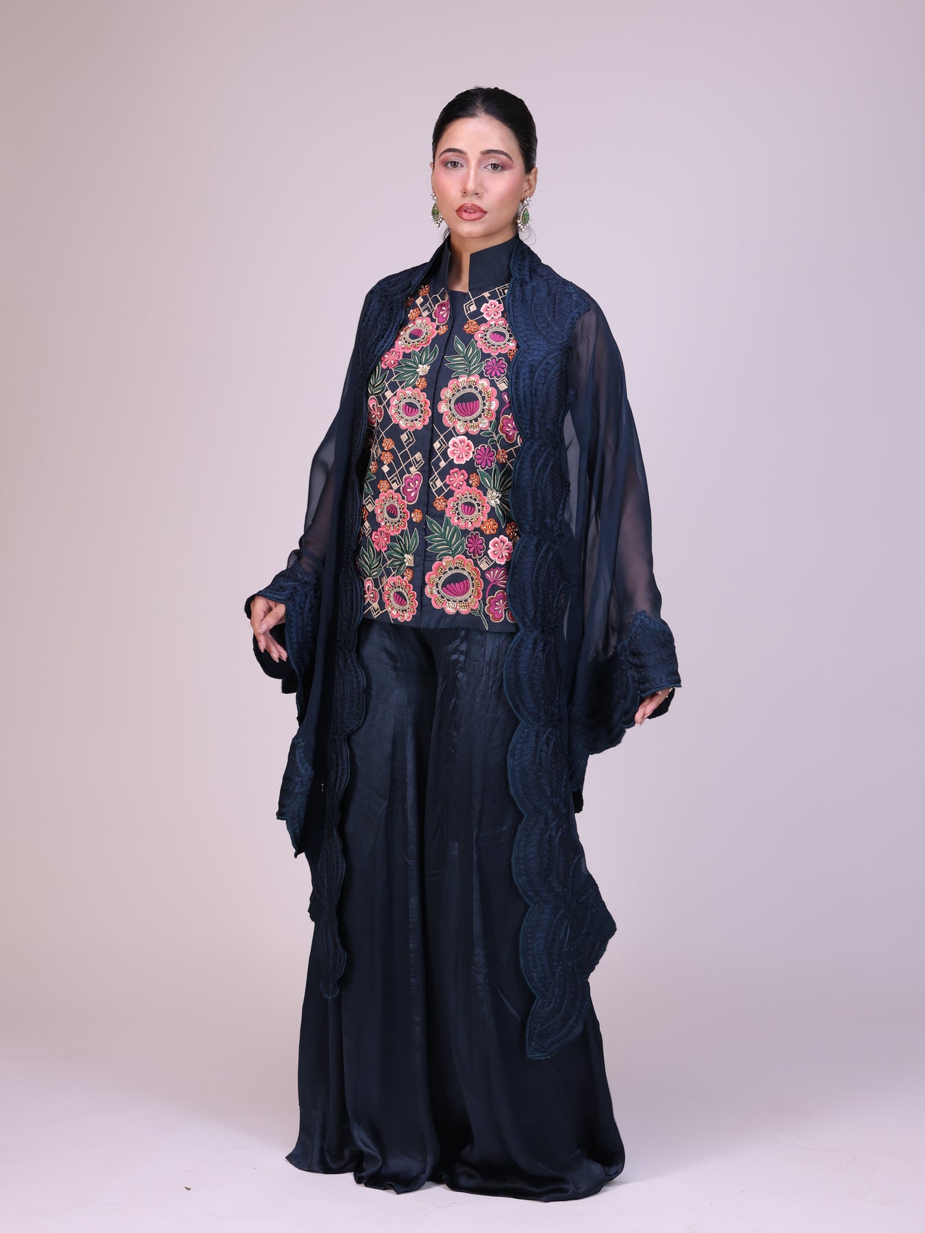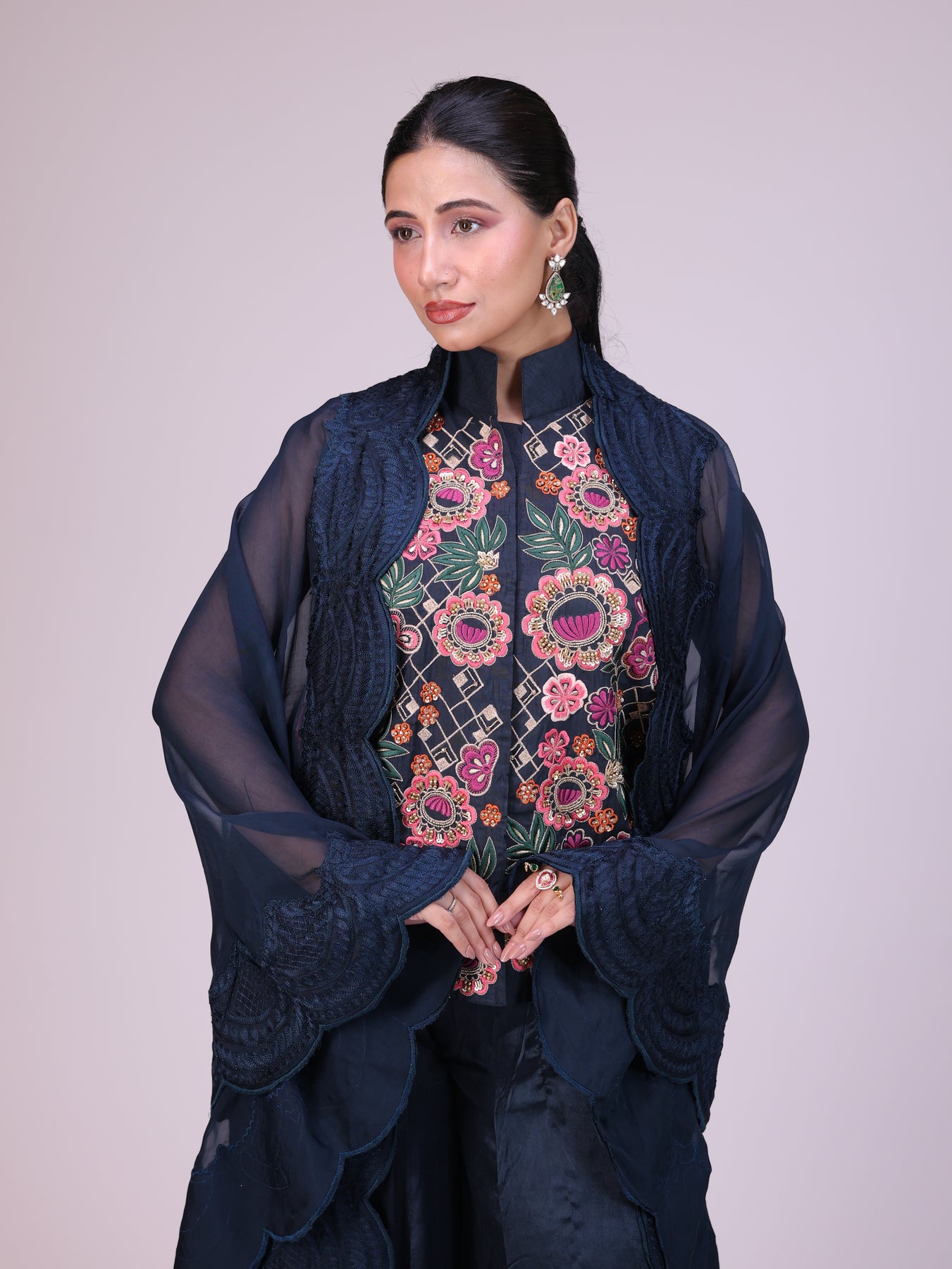 Sophisticated navy co-ord set for women, featuring a floral embroidered jacket intricately handcrafted on premium fabric. Paired with flowy sharara pants and a sheer cape, this designer ensemble blends artisanal detailing with a contemporary silhouette—making it an elegant choice for weddings, festive occasions, and modern celebrations.